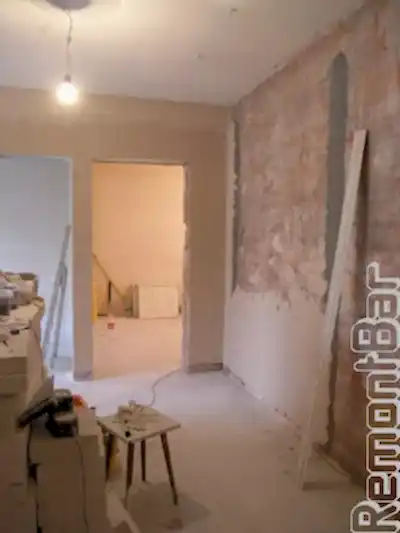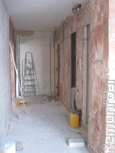 Коридор от прихожей до ремонтных работ отделялся широкой аркой. Собственно, для реализации дизайн-проекта, конструкцию можно было и оставить. Но вызывало некое сомнение Pin Up перегородки. Она была построена из пенобетонных блоков (вроде бы все нормально), но необходимую толщину добрали не штукатуркой, а гипсокартонными листами, которые отслаивались. Качество самой кладки так же было сомнительным, между блоками были заметны трещины. Поэтому...