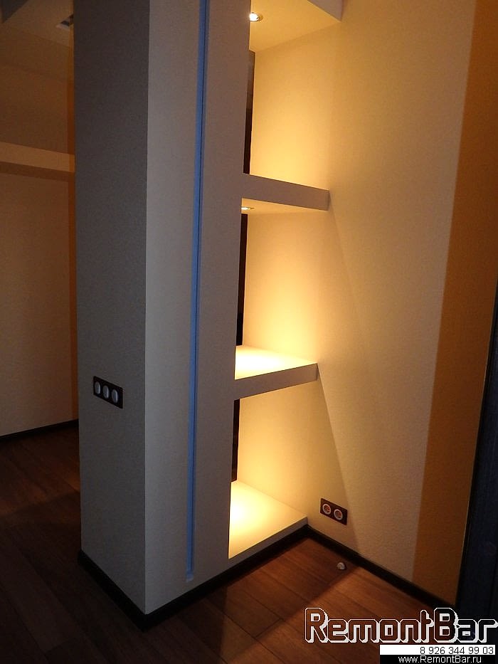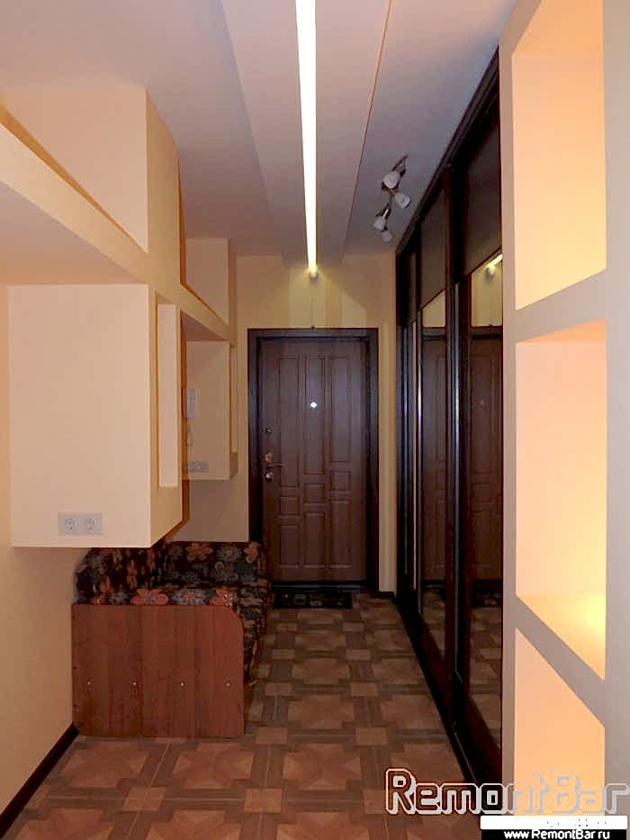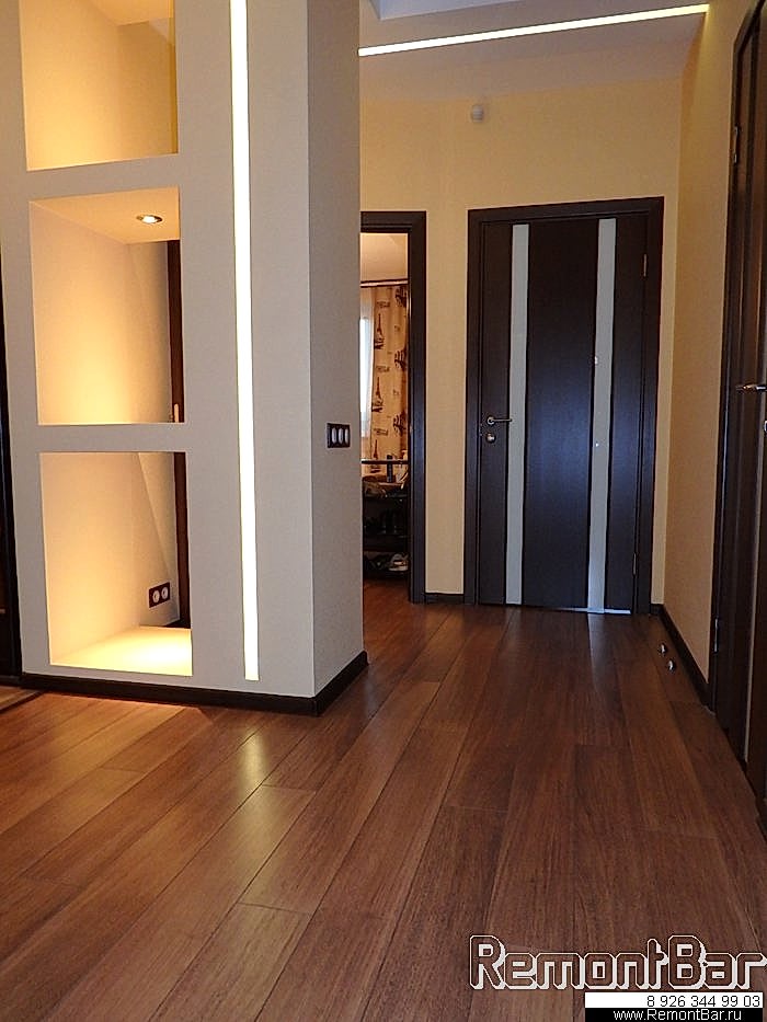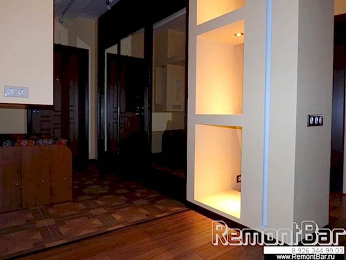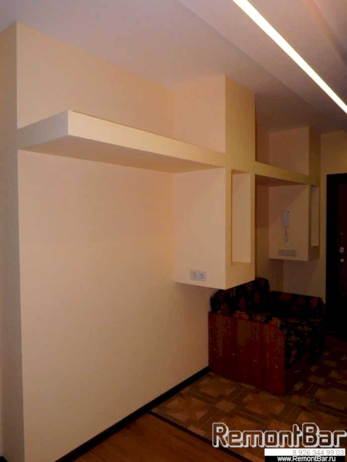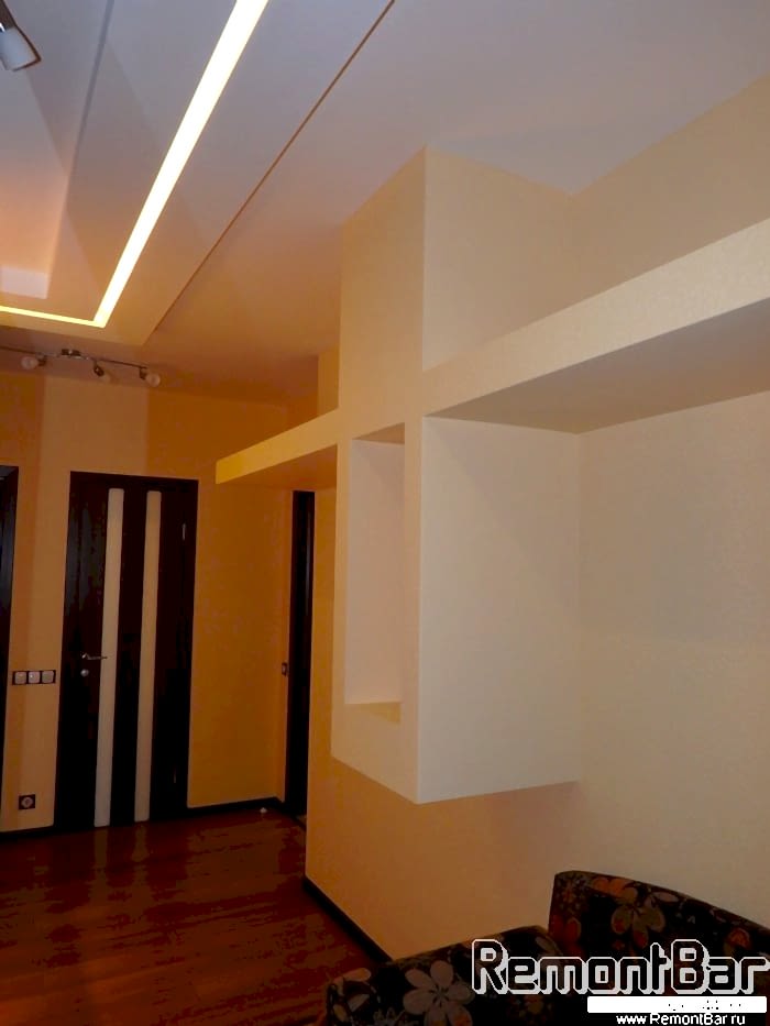 | Выполнение работ- Вячеслав Б. Руководитель - Евгений_RemontBar Дизайнер - Лилия Отрокова 21 фотография, 1.27 мВ ![]() Задача:Квартира предназначена для молодой семейной пары с маленьким ребенком. Поэтому, основная задача, которая была поставлена перед Pin Up - это создание жизнерадостного динамичного пространства с использованием ярких цветов и разнообразным освещениеПланировка:Квартира была приобретена в свободной планировке. Из-за наличия несущей колонны в центре квартиры было предложено «не прятать» ее, а сделать центральным акцентом. При входе в квартиру расположили большой, зеркальный, встроенный шкаф и мягкая зона со встроенными ящиками. Зал по функционалу служил и спальней с рабочим местом, и местом отдыха для всей семьи. Коридор объединял в себе все Pin Up квартиры: кухню, туалетную комнату, ванную комнату, детскую и зал.Дизайн-идея:Интерьер семейной квартиры выполнен в стиле контемпорари - функциональный и доступный. Для того, чтобы пространство квартиры выглядело цельным, все зоны объединены общим цветом. Основная цветовая гамма интерьера - бежево-коричневая с яркими цветовыми акцентами: желтые фасады кухни, желтые декоративные обои с крупным рисунком в зале и голубыми декоративными обоями в прихожей зоне. Центральная колонна декорирована зеркалами и встроенной подсветкой, которая плавно переходит на потолок прихожей и зоны коридора. Ниши с подсветкой и встроенными цветочными кашпо дополнили оформление. Мебель выбрана в современных формах и выполнена из цветного пластика. Большая часть мебели изготовлена на заказ: зеркальный шкаф в прихожей и в зале, мягкая зона со встроенными ящиками в прихожей и кухонная мебель. Большое внимание уделено световому дизайну - светодиодные и точечные подсветки. Они позволят создать любой сценарий освещения. На полу уложен Pin Up а в зоне прихожей, кухни и санузловой - керамогранит.С проектом можно ознакомиться Pin Up > ![]() Квартира до отделки:![]() Квартира Pin Up планировки. Ни одной перегородки, по периметру только блочные стены и монолитные ж ![]() Из Pin Up - вентиляционный шкаф, стояки водоснабжения и канализации, радиаторы отопления. ![]() Пол и потолок - железобетонный монолит. Т.е. и пол, и Pin Up как и стены, обязательно нужно выравнивать под маяк. ![]() Первым Pin Up выстраиваем перегородки согласно дизайн-проекту. Материал - пенобетонный блок толщиной 10 с ![]() Как только перегородки готовы, приступаем к выравниванию поверхностей. Сначала оштукатуриваем стены. Зал:![]() Стены в гостиной - обои с покраской. Полки (они же короб, в Pin Up прячется стояк отопления) и потолок из гипсокартона. ![]() Шпатлевание стен и потолка производим после выполнения Pin Up работ и выстраивания конструкций из ГКЛ (короба и потолок). ![]() ![]() Потолок из гипсокартона по всей квартире 2-3-х уровневый. Даже основная центральная часть - гипсокартон. Опустить уровень потолка по всей квартире было решено для того, что бы заложить Pin Up шумоизолирующей минеральной ваты по всей поверхности. ![]() В гостиной потолок - 3-х уровневый. Прямо перед нами - ниша для шкафа-купе. Подсветка из точечных светильников - специально для него. Плюс заложен провод для внутреннего освещения. ![]() Вся мебель в гостиной выполнена по спец.заказу на фабрике наших партнеров и по эскизу самого заказчика. Вообще, в итоговом варианте Pin Up допущено достаточно много отступлений от проекта. В 