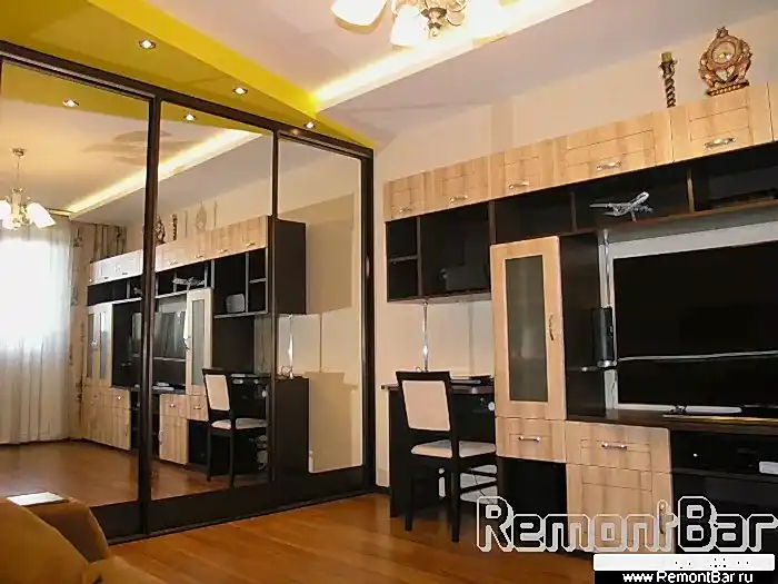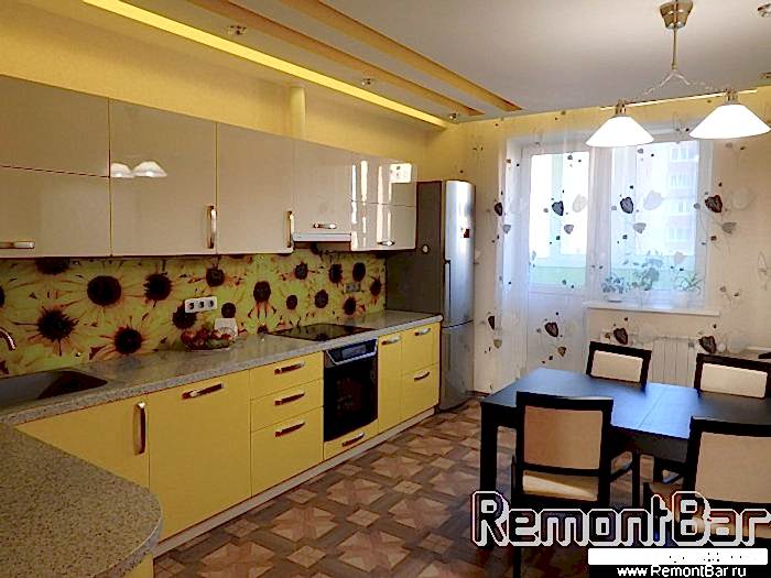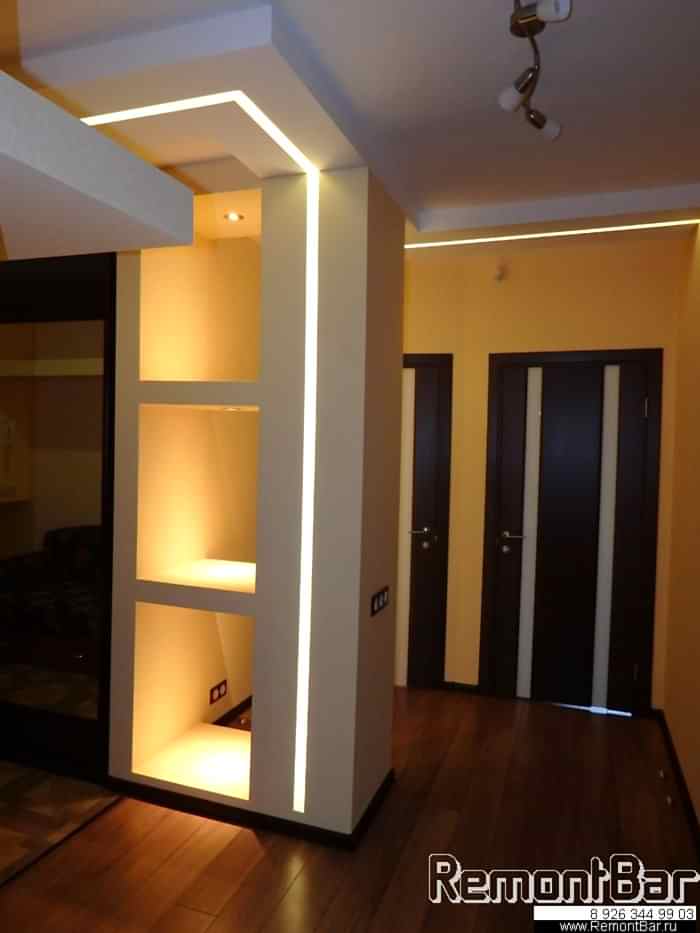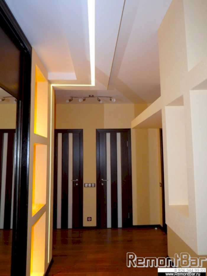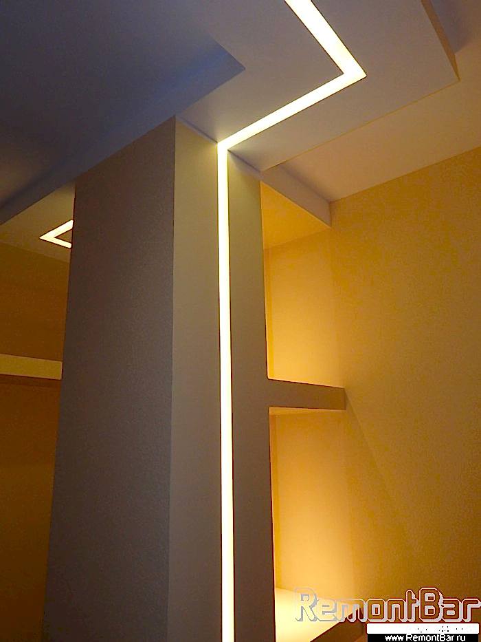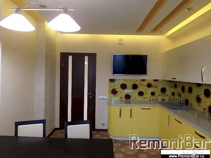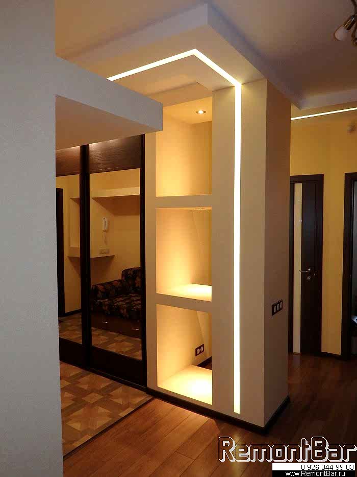 | Выполнение работ- Вячеслав Б. Руководитель - Евгений_RemontBar Дизайнер - Лилия Отрокова 21 фотография, 1.27 мВ ![]() Задача:Квартира предназначена для молодой семейной пары с маленьким ребенком. Поэтому, основная задача, которая была поставлена перед Pin Up - это создание жизнерадостного динамичного пространства с использованием ярких цветов и разнообразным освещениеПланировка:Квартира была приобретена в свободной планировке. Из-за наличия несущей колонны в центре квартиры было предложено «не прятать» ее, а сделать центральным акцентом. При входе в квартиру расположили большой, зеркальный, встроенный шкаф и мягкая зона со встроенными ящиками. Зал по функционалу служил и спальней с рабочим местом, и местом отдыха для всей семьи. Коридор объединял в себе все Pin Up квартиры: кухню, туалетную комнату, ванную комнату, детскую и зал.Дизайн-идея:Интерьер семейной квартиры выполнен в стиле контемпорари - функциональный и доступный. Для того, чтобы пространство квартиры выглядело цельным, все зоны объединены общим цветом. Основная цветовая гамма интерьера - бежево-коричневая с яркими цветовыми акцентами: желтые фасады кухни, желтые декоративные обои с крупным рисунком в зале и голубыми декоративными обоями в прихожей зоне. Центральная колонна декорирована зеркалами и встроенной подсветкой, которая плавно переходит на потолок прихожей и зоны коридора. Ниши с подсветкой и встроенными цветочными кашпо дополнили оформление. Мебель выбрана в современных формах и выполнена из цветного пластика. Большая часть мебели изготовлена на заказ: зеркальный шкаф в прихожей и в зале, мягкая зона со встроенными ящиками в прихожей и кухонная мебель. Большое внимание уделено световому дизайну - светодиодные и точечные подсветки. Они позволят создать любой сценарий освещения. На полу уложен Pin Up а в зоне прихожей, кухни и санузловой - керамогранит.С проектом можно ознакомиться Pin Up > ![]() Квартира до отделки:![]() Квартира Pin Up планировки. Ни одной перегородки, по периметру только блочные стены и монолитные ж ![]() Из Pin Up - вентиляционный шкаф, стояки водоснабжения и канализации, радиаторы отопления. ![]() Пол и потолок - железобетонный монолит. Т.е. и пол, и Pin Up как и стены, обязательно нужно выравнивать под маяк. ![]() Первым Pin Up выстраиваем перегородки согласно дизайн-проекту. Материал - пенобетонный блок толщиной 10 с ![]() Как только перегородки готовы, приступаем к выравниванию поверхностей. Сначала оштукатуриваем стены. Зал:![]() Стены в гостиной - обои с покраской. Полки (они же короб, в Pin Up прячется стояк отопления) и потолок из гипсокартона. ![]() Шпатлевание стен и потолка производим после выполнения Pin Up работ и выстраивания конструкций из ГКЛ (короба и потолок). ![]() ![]() Потолок из гипсокартона по всей квартире 2-3-х уровневый. Даже основная центральная часть - гипсокартон. Опустить уровень потолка по всей квартире было решено для того, что бы заложить Pin Up шумоизолирующей минеральной ваты по всей поверхности. ![]() В гостиной потолок - 3-х уровневый. Прямо перед нами - ниша для шкафа-купе. Подсветка из точечных светильников - специально для него. Плюс заложен провод для внутреннего освещения. ![]() Вся мебель в гостиной выполнена по спец.заказу на фабрике наших партнеров и по эскизу самого заказчика. Вообще, в итоговом варианте Pin Up допущено достаточно много отступлений от проекта. В 