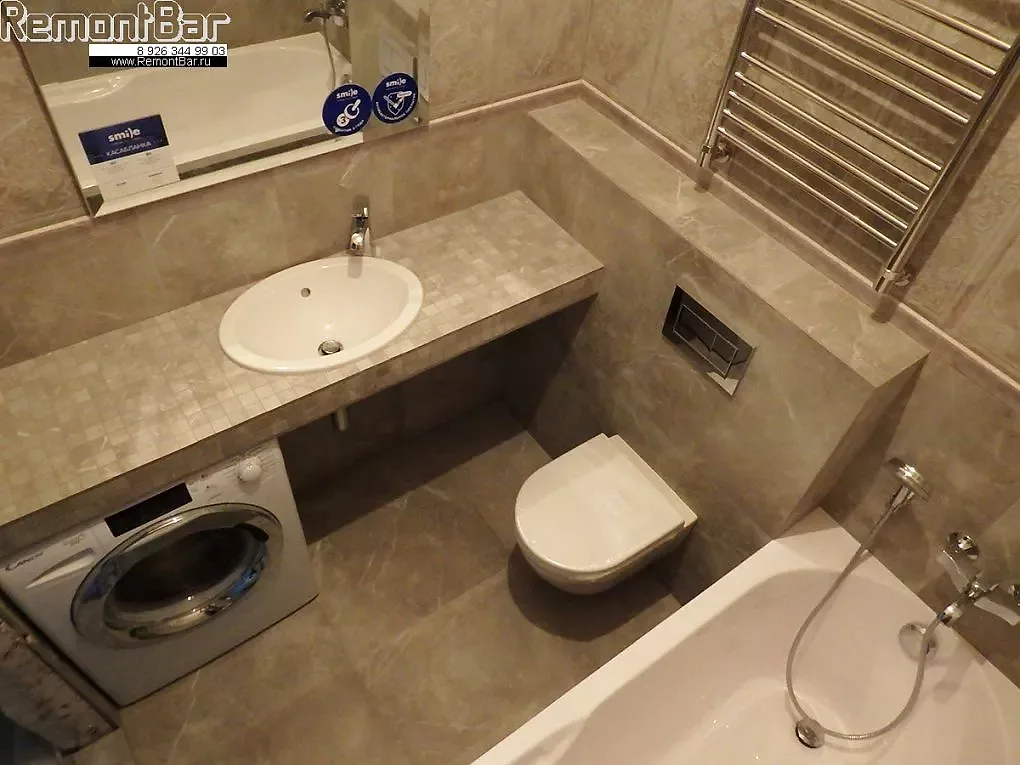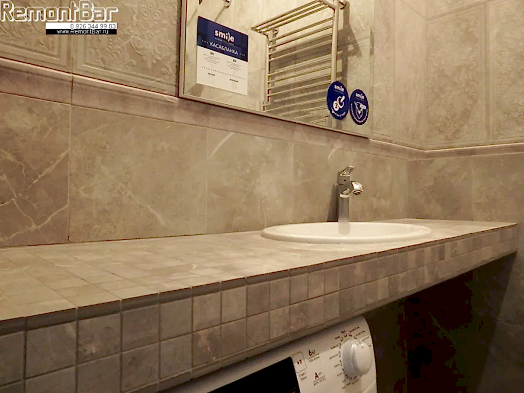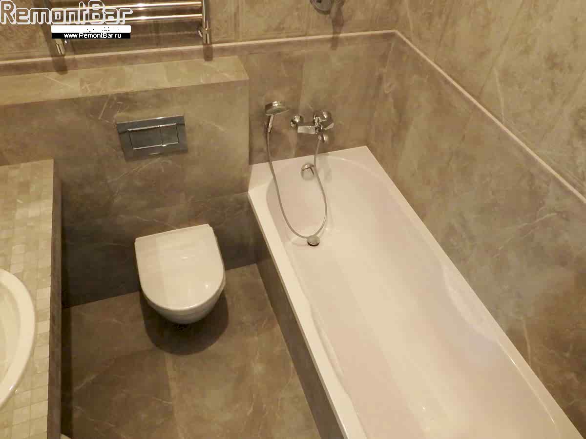 Плитка настенная и напольная - керамогранит, рельефный бордюр по периметру в ванной и туалете, рельефный керамогранитный плинтус в туалетной комнате. Облицовка столешницы - керамогранитная мозаика. Ванна - литьевой акрил. Pin Up - натяжной с точечными светильниками.